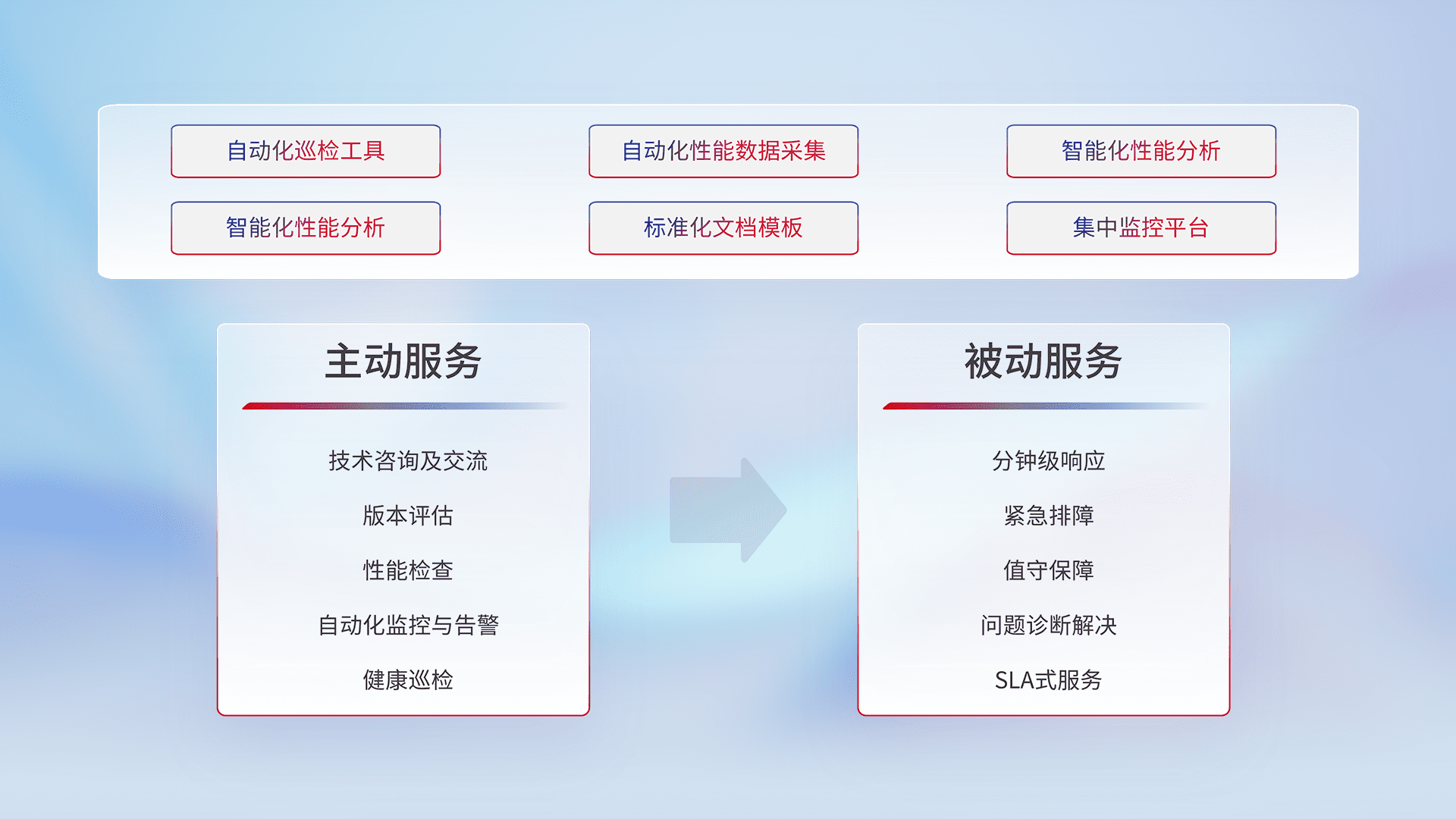 智能化工具和标准化文档,,保障服务质量,,,,提供主动服务(包含技术咨询、、、、版本评估、、、、性能检查、、自动化监控与告警、、、健康巡检)和被动服务包含(分钟级响应、、、、紧急排障、、、、值守保障、、、、问题诊断解决、、、SLA服务)。。。。